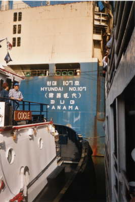 Alles ganz eng. Das kleine Schiff ist ein Schubschiff, welches den Transporter um die Kurven schiebt!